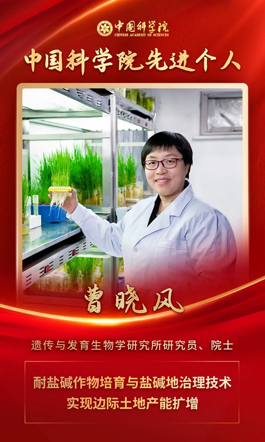 曹晓风院士胸怀“国之大者”,长期致力于植物表观遗传学研究并取得国际公认的成就。面向国家粮食安全重大需求及盐碱地综合利用战略布局,她毅然将科研主攻方向转向盐碱地生物改良这一世界性难题。作为中国科学院重点部署项目边际土地产能效益扩增机理与藏粮于地技术模式项目负责人、中国科学院“黑土粮仓”科技会战先导专项课题负责人、中国科学院抢占科技制高点重大科技任务科学顾问,她带领团队长期深入艰苦的盐碱地一线,成功发掘并培育出耐盐碱先锋植物田菁系列新品系,创建的“田菁高效建植生物改良盐碱地技术”入选2025年中国农业重大新技术,在东北、新疆等地示范推广面积已达5万余亩,为推动我国北方盐碱荒(草)地改良与修复、保障国家粮食安全作出了突出贡献,真正将论文写在祖国大地上。